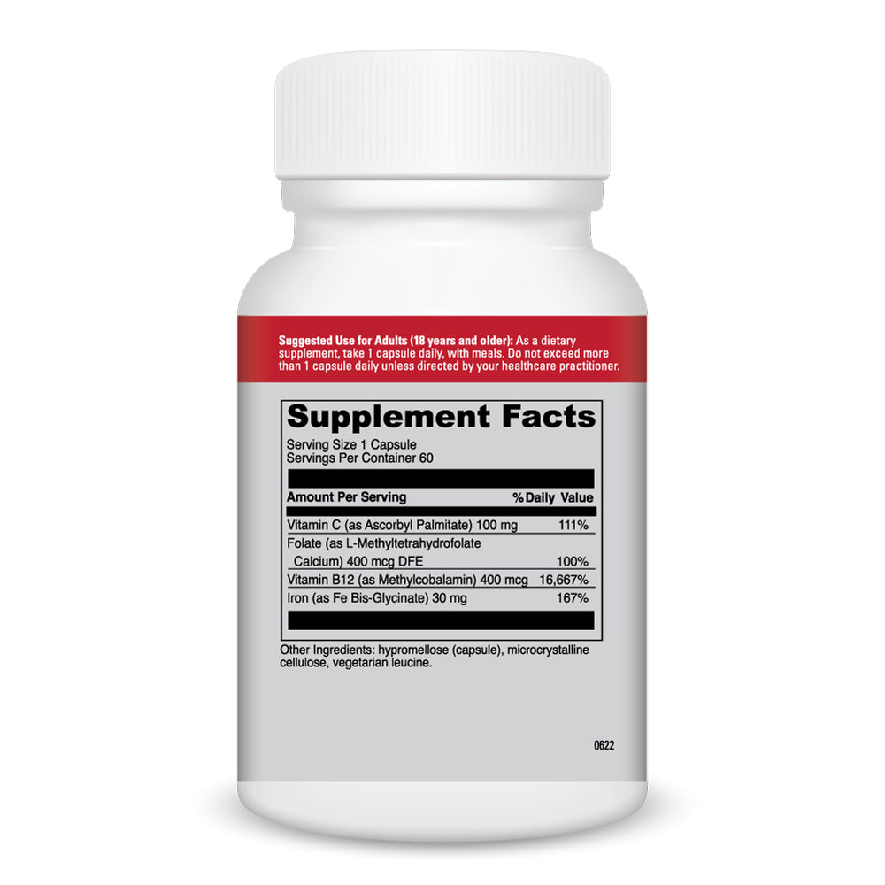 Folic Acid and Vitamin B12 in the methylcobalamin form. Iron bis-glycinate